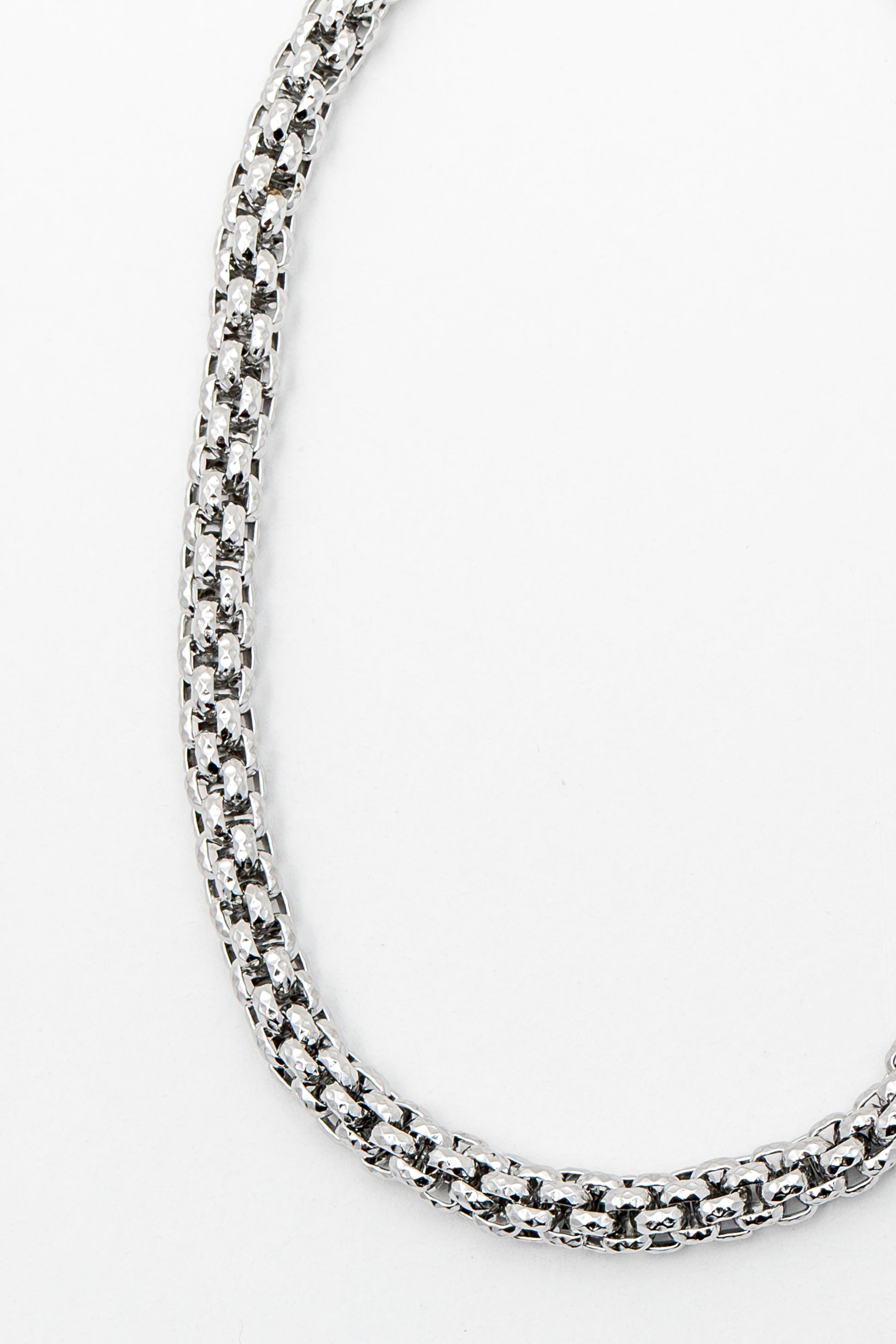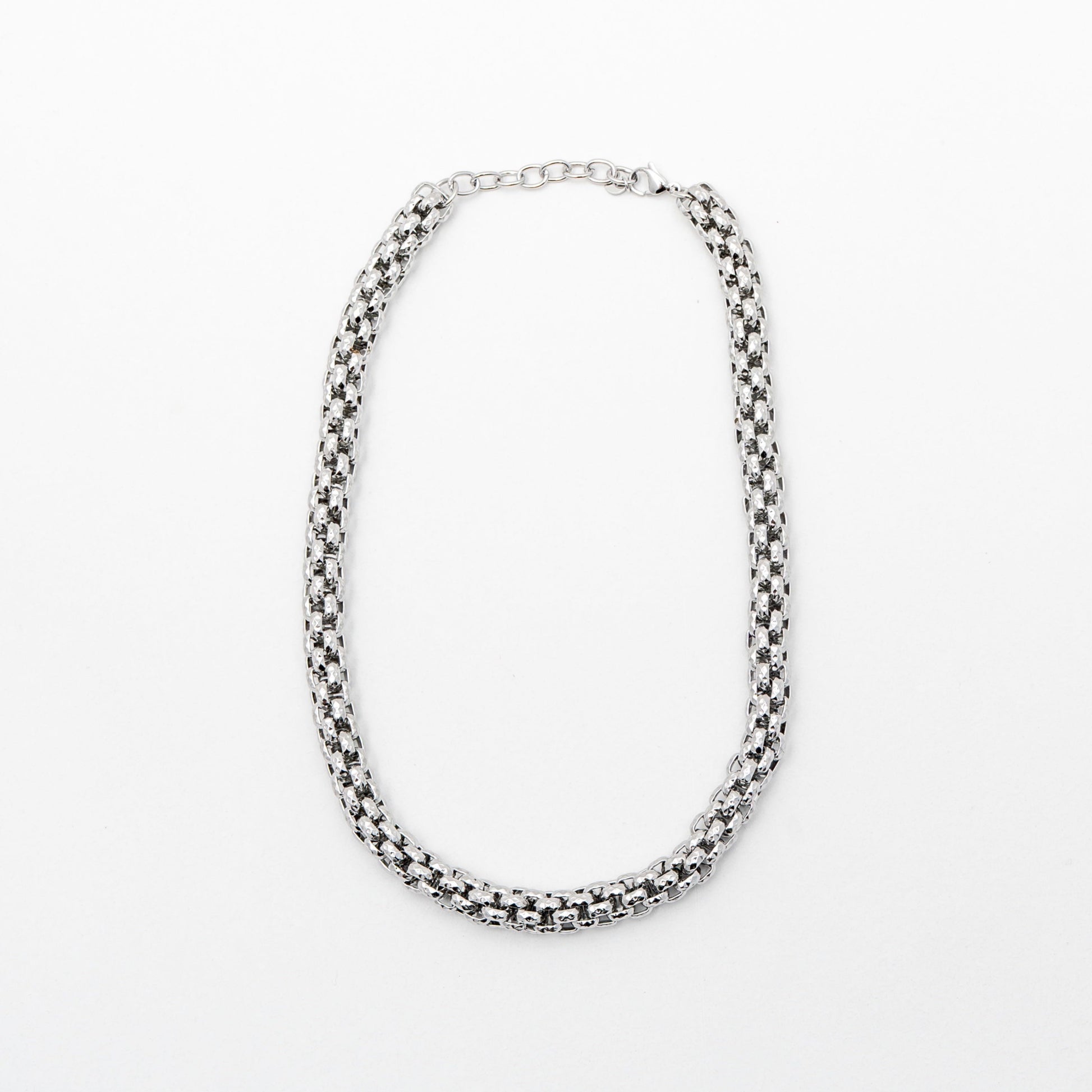 Collana in acciaio inossidabile 316L, lunghezza 45 cm + 5 cm di prolunga, con maglia cilindrica definita. La sua lucentezza discreta cattura la luce in ogni movimento, rendendola un gioiello che non passa inosservato. Non cambia colore e non provoca allergie, pensata per accompagnarti con sicurezza in ogni momento. Indossala con i capelli sciolti: diventa subito protagonista, senza bisogno di altri accessori, un dettaglio deciso che parla di te.