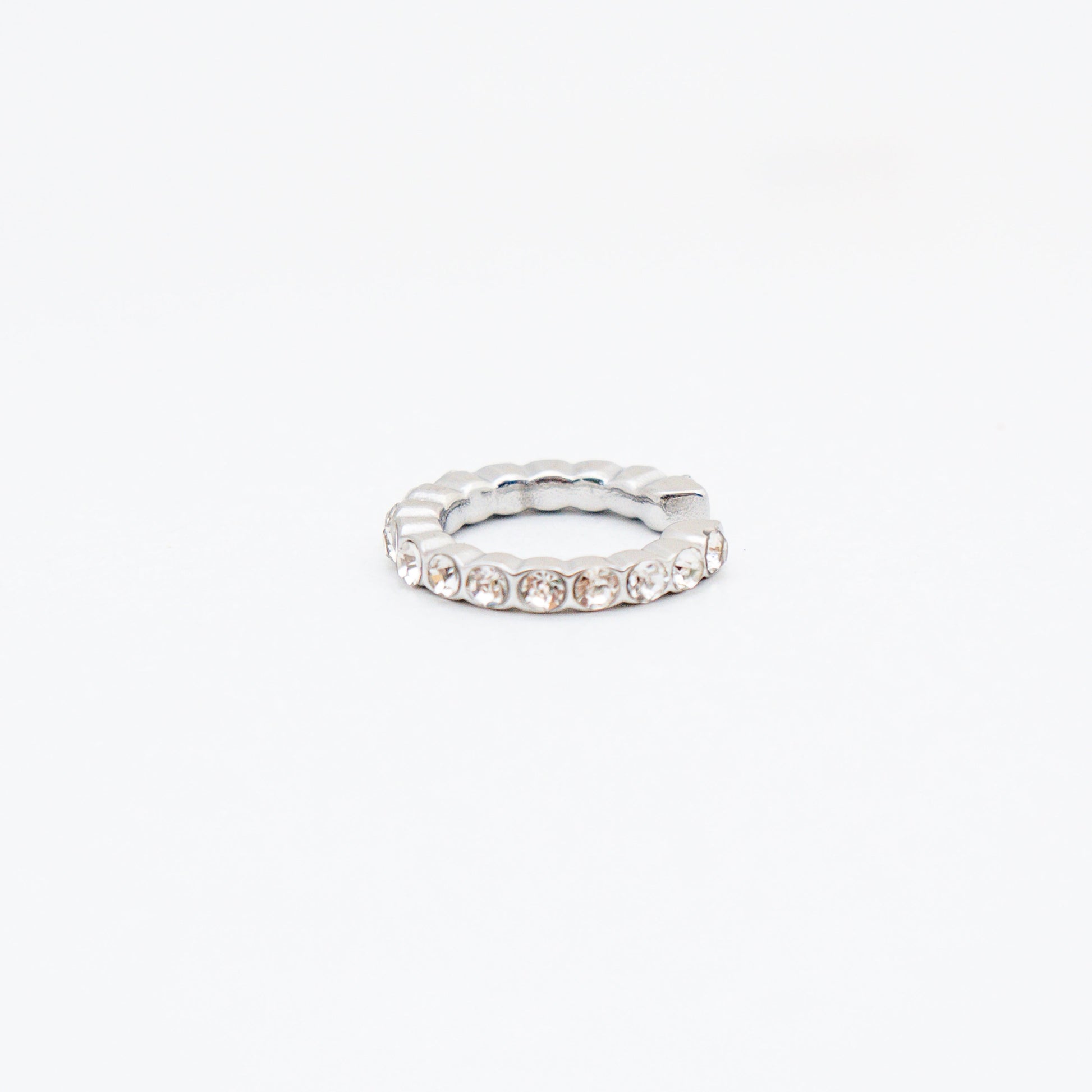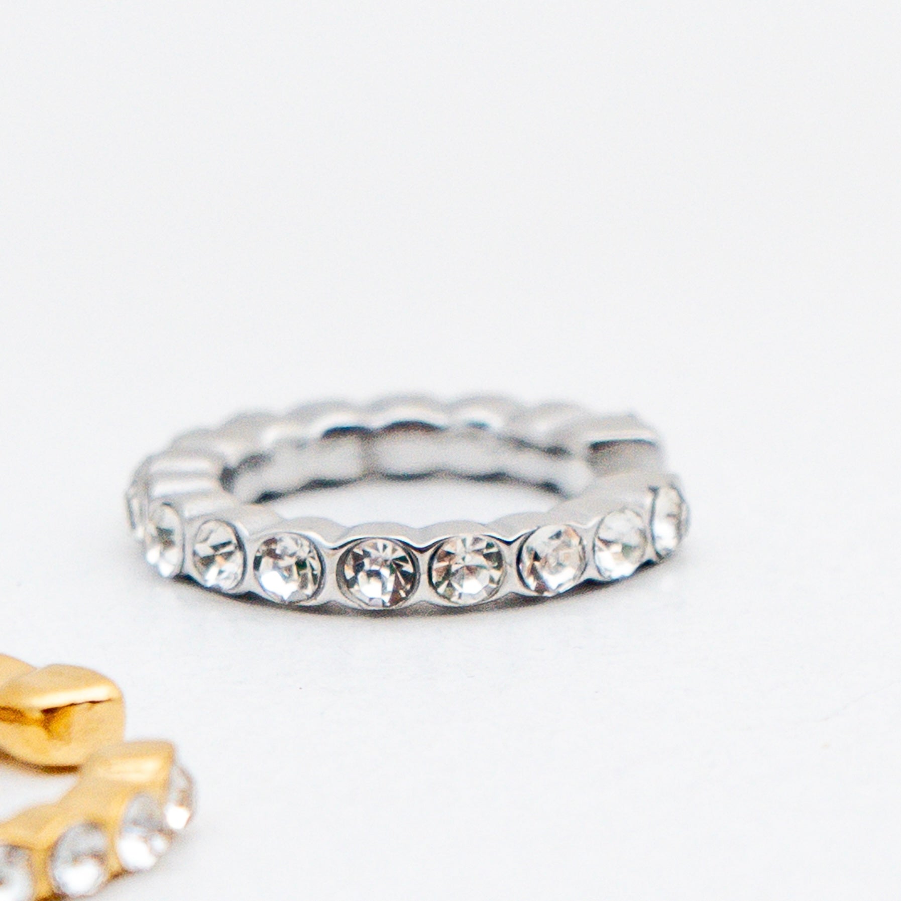 Un ear cuff luminoso e raffinato, realizzato in acciaio inossidabile 316L e impreziosito da una fila continua di zirconi taglio brillante che corre da un’estremità all’altra.