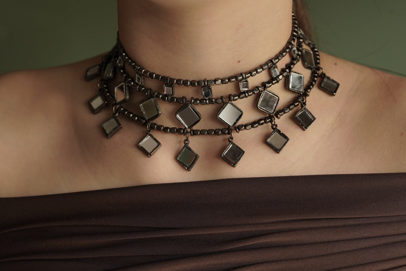 L’elemento distintivo del design è dato dai suoi specchietti a forma di rombo, che catturano la luce e la restituiscono con un effetto raffinato e vibrante. Gli specchietti superiori sono incastonati nella struttura della collana, creando una linea più compatta e ordinata; quelli inferiori, invece, sono dondolanti, applicati tramite un piccolo gancio che permette loro di muoversi delicatamente seguendo i movimenti del corpo. Questo contrasto tra parti fisse e parti in movimento rende la collana dinamica, luminosa e piena di personalità.